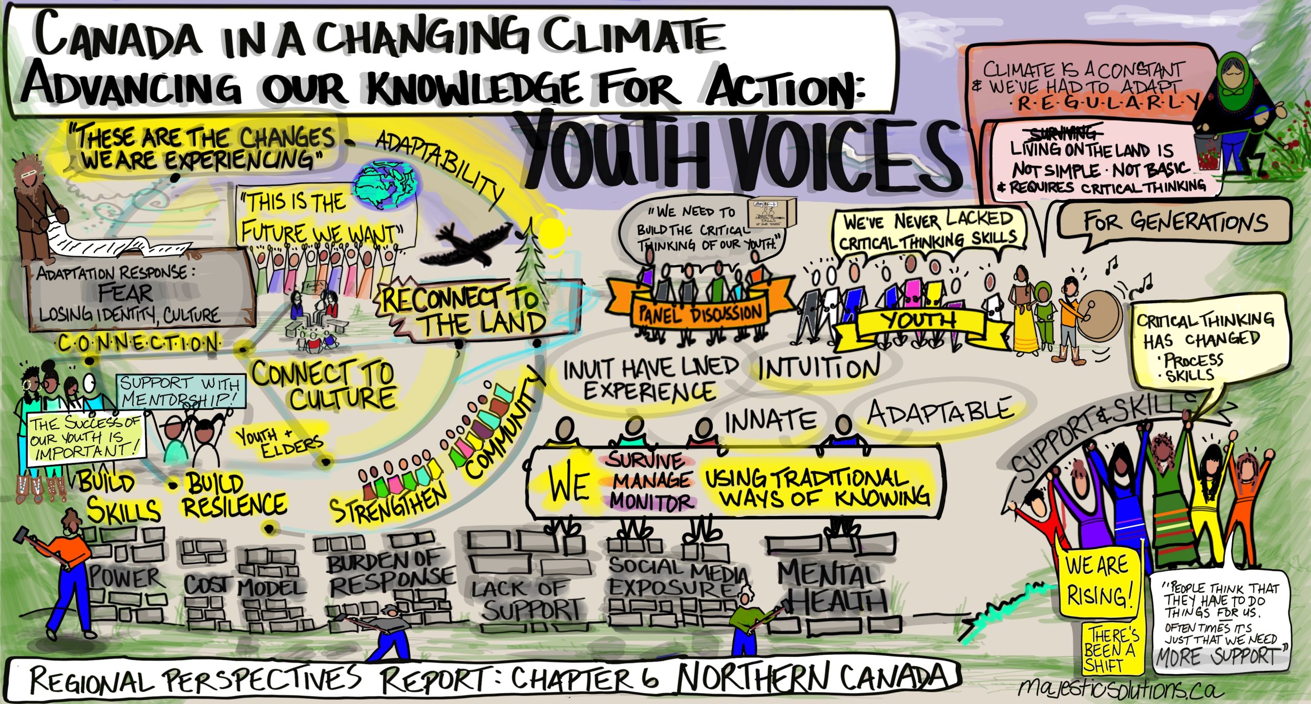 Graphics: These graphics were inspired by the Northern Canada chapter of the Canada in a Changing Climate: Regional Perspectives Report, as well as by discussions that took place about the report at the ArcticNet 2022 conference, and conversations with youth from Nunatsiavut. Developed by Majestic Solutions and Yukon University, this series of graphics for communicating climate change impacts, adaptation and resilience in the North is available in English and in Inuktitut.